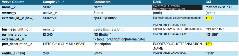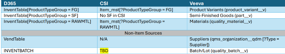 For example, when data is transferred from D365 or CSI, the synchronization is filtered by predefined Product Type Groups. Only Finished Goods (FG), Semi-Finished Goods (SF), and Raw Materials (RAWMTL) from specific entities are eligible to be synced into Veeva Vault. This ensures that only relevant data from these entities is transferred, while records from other entities are excluded until needed in future phases.