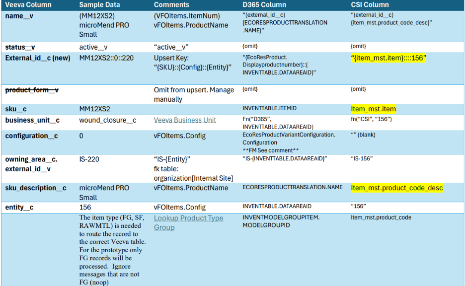For example, a Finished Good (FG) in D365 might have multiple attributes such as SKU, Product Configuration, and Business Unit. DynaTech ensures that these attributes are mapped to their equivalent fields in Veeva Vault and that an external ID is generated to maintain a unique link between these systems.